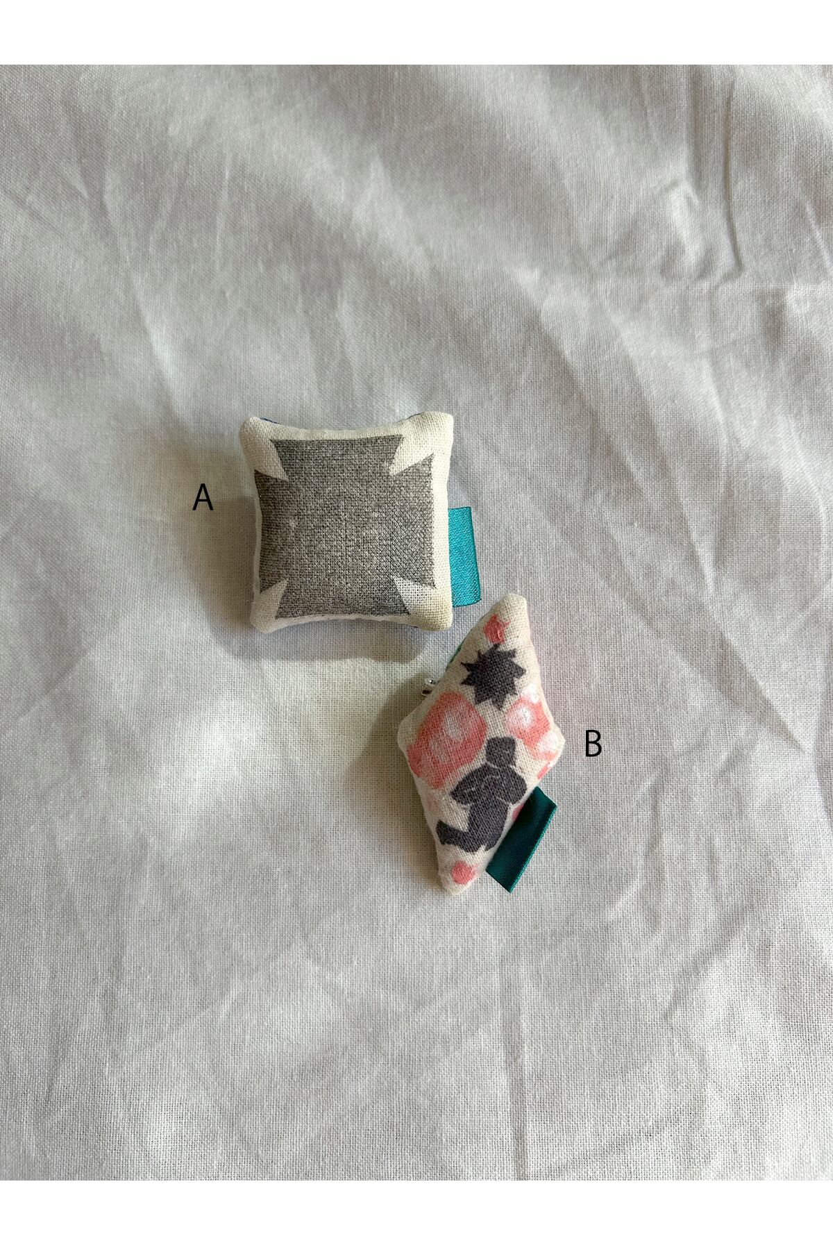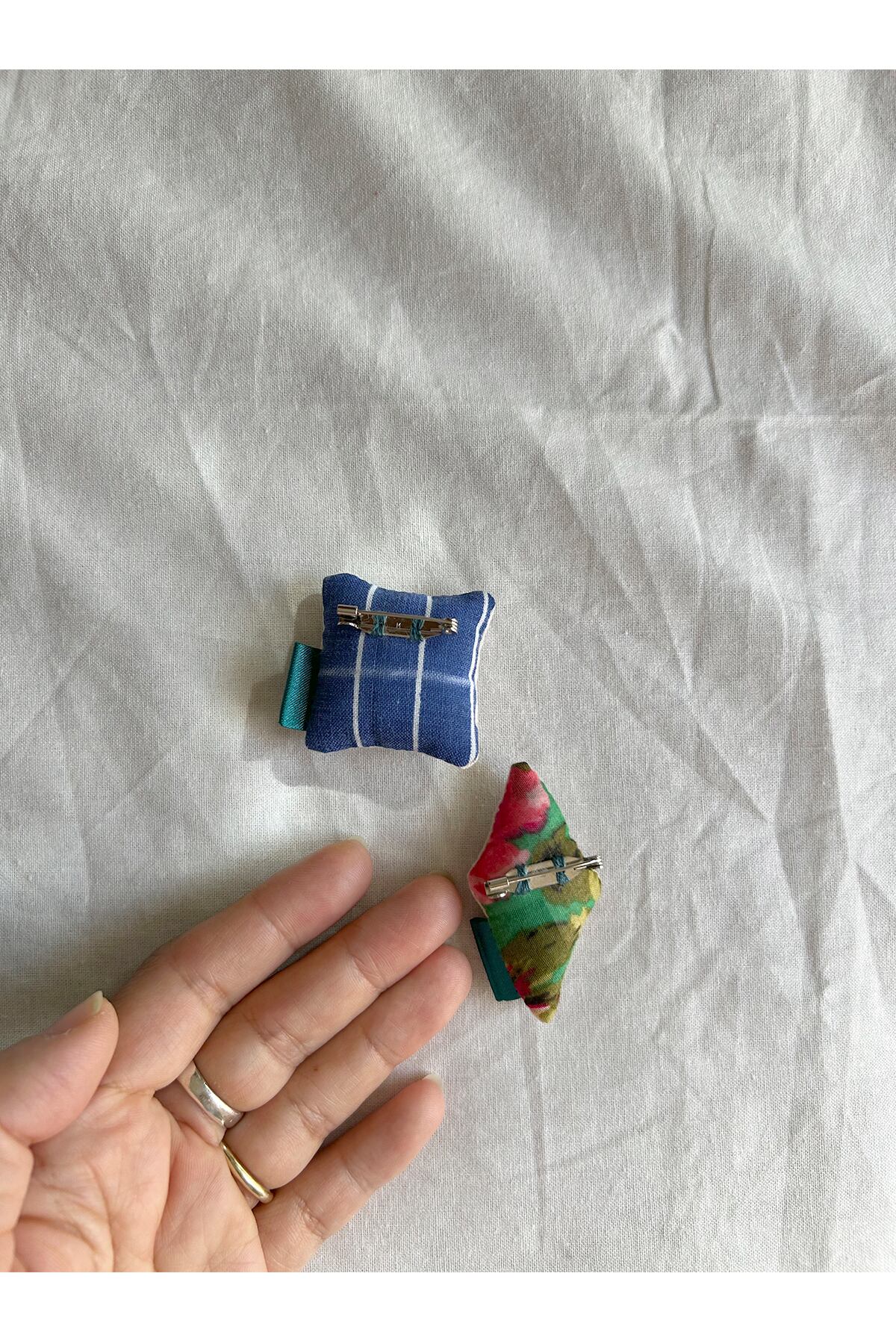 手彫りスタンプで製作した生地をブローチに仕立てました。中にワタが入っていて立体的です。
