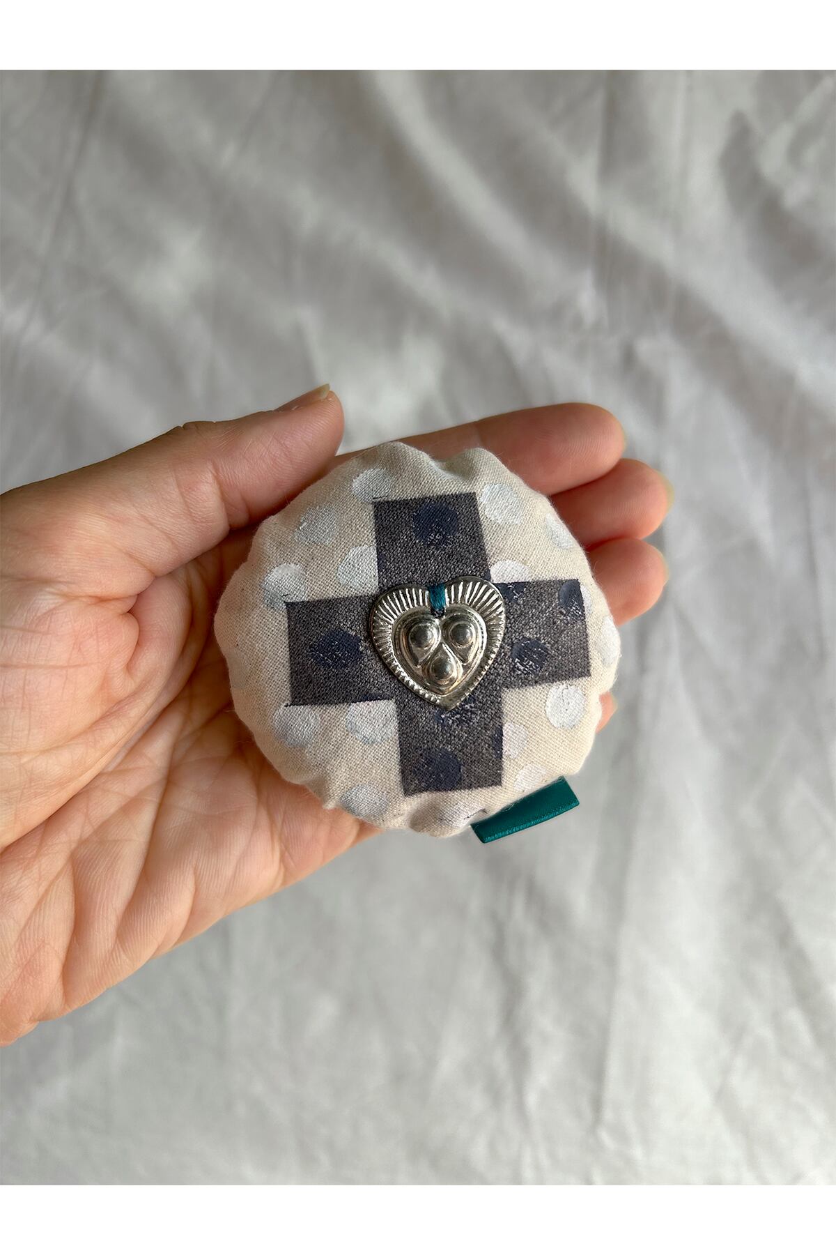 手彫りスタンプで製作した生地をブローチに仕立てました。中にワタが入っていて立体的です。