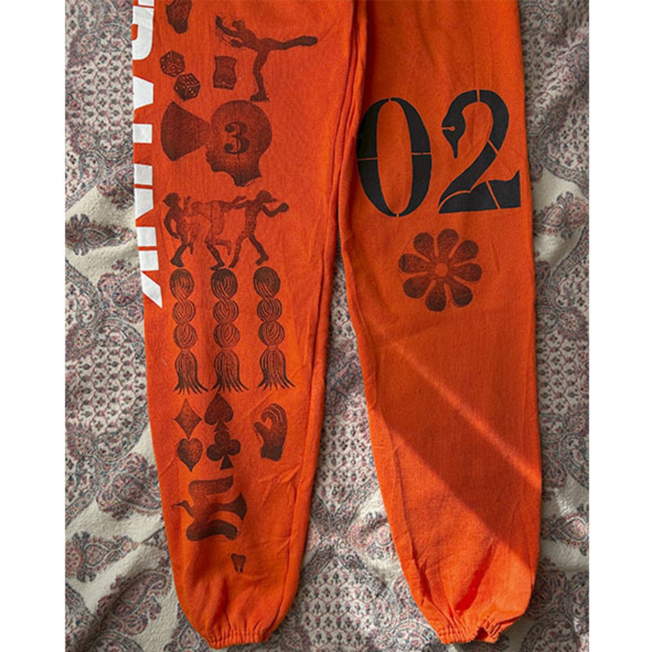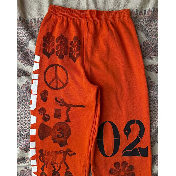 古着のスウェットパンツを手彫りスタンプでカスタム・リメイクしました。
